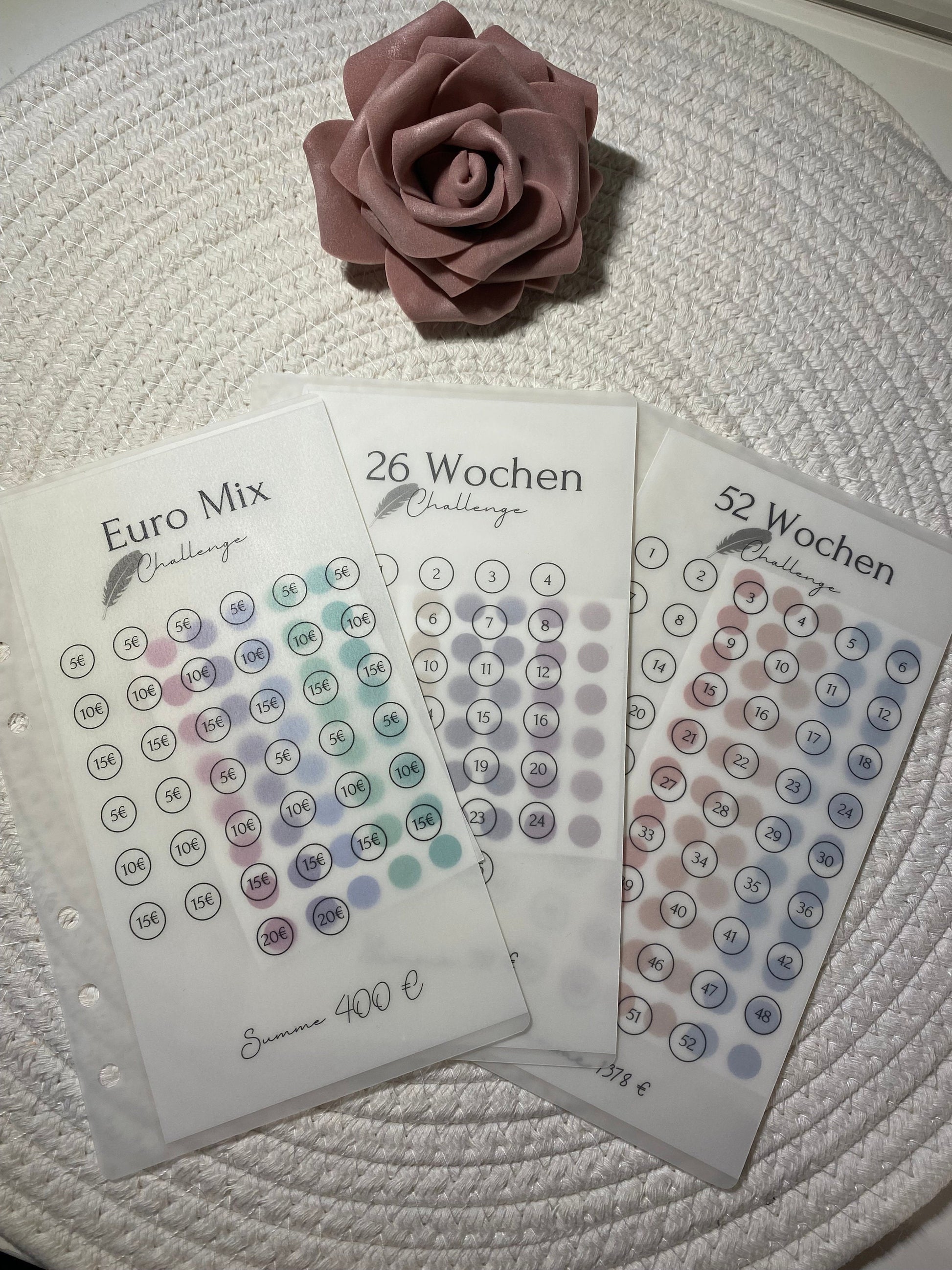 - Challenge SET ( bestehend aus 5€ + 10 €+ 20 € + Euro Mix + 26 Wochen + 52 Wochen ) inkluisve Punkten